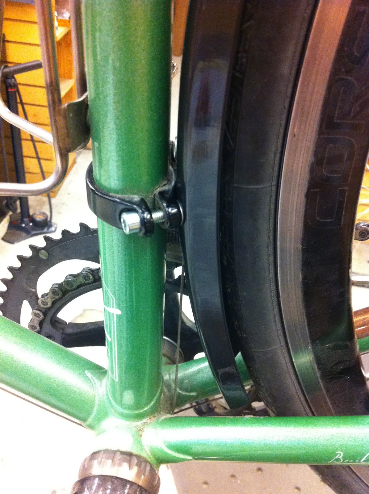 The other day Chris DiStefano brought in his Cielo asking for me personally to put fenders on it. Seeing as how we live in Portland it is kind of essential. If he didn’t this bike would sit in a garage while it rained for the next 7 months. The only problem is there were no eyelets to mount the fenders to and CD said it was to look clean. No zipties.